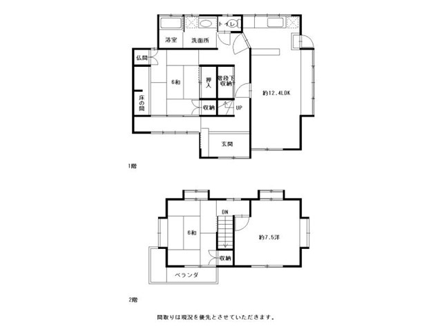 間取り | 2F)7.5洋・6和・ベランダ 1F)6和・12.4LDK | |||