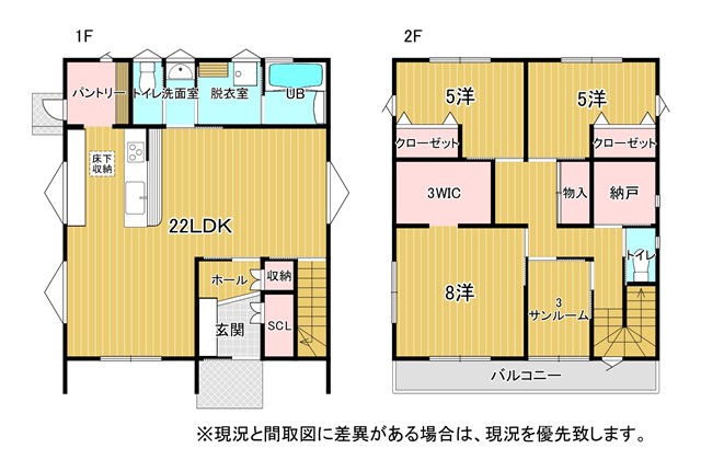 | 間取り | 2F)8洋(3WIC)・5洋・5洋・3サンルーム・2納戸・1物入・T・バルコニー 1F)22LDK(2パントリー)・T・洗面・UB・脱衣室 | |||
