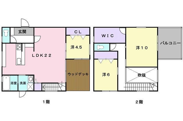 | 間取り | 2F)10洋・6洋・WIC・T・バルコニー 1F)4.5洋・22LDK・ウッドデッキ | |||