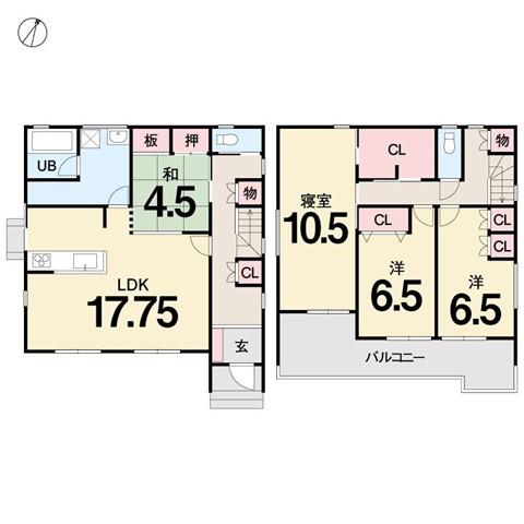| 間取り | 2F)10.5洋・6.5洋・6.5洋・T・バルコニー 1F)4.5和・17.75LDK | |||
